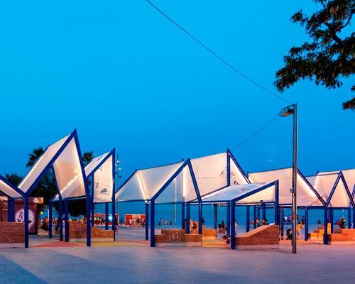 on the occasion of BCN re.set, organized by architecture office EMBT, the ‘xarranca pavilion’ has been built in the beachfront plaça del mar, in barcelona. the project results from a collaboration between urban-think tank, the brillembourg & klumpner chair of architecture and urban design at ETH zürich, and the ESARQ-UIC. the temporary structure creates a playful environment which promotes cultural exchange and social activity. referencing the children’s game of hopscotch, the arrangement leads visitors through a sequence of spaces from sòl (ground) to cel (sky). it is composed of a series of blue frames, with a variety of half height walls and swings interspersed which serve as seating. during the day, canopies shade visitors from the sun, while lights integrated within the framework illuminate the space at night.