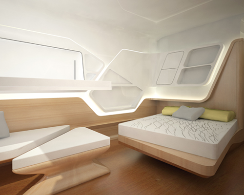 zaha hadid architects has created a space of well-being accommodating the needs of a long term alternative home for families within a 25 meter sq. space. the design is comprised of two shells – wooden one that lines the bottom half of the space, and a white one on top – that characterize the marine look and feel of the living areas. these two capsules meet at an undulating horizon line at approximately 1.2 meters high, that is highlighted by an indirect light strip that provides ambient luminosity.
