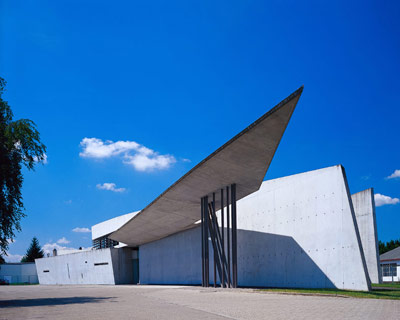 the building itself is divided in two and creates a linear typology for an open plan with interior lines that behave like volumes and layer within themselves. drawing from the monumental tectonic weight of richard serra, the building sports steel room dividers that continue an illusion of spatial instability. the overall effect of the intersecting concrete volumes is a sensation of energetic movement in almost tectonic proportions. mass is suspended on multiple scales, from the protruding roof to the cantilevered steps of the interior stair. while all lines meet in the center of the space and entrance, the two levels appear to slide past each other, with the upper dining hall seeming to race to a horizon line. the vitra fire station is credited as an exigent moment in zaha hadid’s career, however, the reframed impression of space seems to have more wholly contributed to the possibilities of the built form and has made room for the extraordinary in architecture.