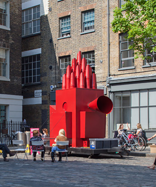the structure is slowly transported through london’s streets by a VW split screen camper van
