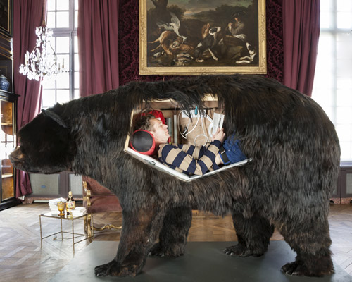 for thirteen days and thirteen nights — beginning on april 1st, 2014 — french artist abraham poincheval is living inside the hollowed-out carcass of a bear, positioned in the center salon at the musée de la chasse et de la nature in paris. just like the mammal during the winter months, poincheval remains within a small enclosure, keeping with him all the basic things he might need to survive throughout the weeks spent inside; food, water, activities and even a place to relieve himself are all contained inside the makeshift unit. by residing within the species, poincheval aims to understand his own physical limits and experience animal nature, a symbolic image of the ‘inside out’ of a bear during hibernation. visitors to the museum are encouraged to interact with the encased artist. the performance is relayed for the public 24 hours a day through a live feed.