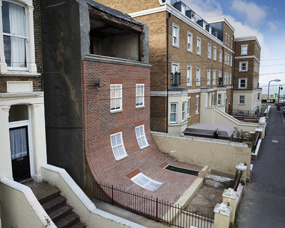 peeling away the original facade, british artist and designer alex chinneck has slid the front off a four storey house in the seaside town of margate in kent, UK. the original, derelict structure had been abandoned for 11 years, and its new face gives the appearance that it just slipped down, onto the ground. the artwork is the result of an innovative collaboration between the artist and british industry, as the self initiated £100,000 project was constructed from donations of materials and professional services from ten different companies. also supported by the arts council, england, the building stands out from its surrounding neighbors and offers a welcoming facelift from the previous discarded house that was an eyesore for the street.