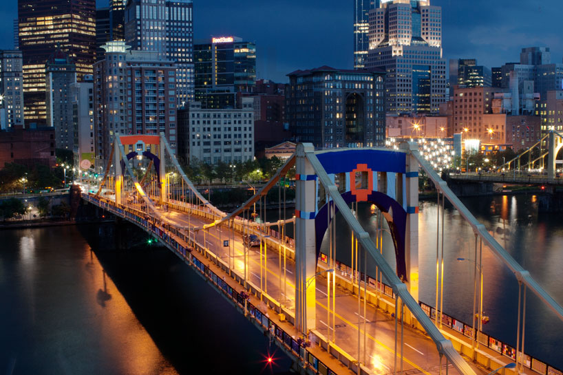 a multicolored arrangement of hundreds of hand-knit and hand-crocheted blankets sweater the exterior of the andy warhol bridge in pittsburgh. knit-the-bridge called on over 1,800 volunteers and team members to help sew vibrant, patterned canvasses that cover the bridge’s entire facade. draped over its sides, towers and main cables are unique rectangular panels, each made by a different artist, bearing a distinct pattern, motif, and chroma. the handles of the pedestrian walkway have been fitted with crocheted sections, and the tower required the special assistance of technical workers, who cloaked the industrial cables with a selection of handmade art.