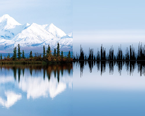 a mountainous landscape reflecting onto the water is matched up to a sound wave