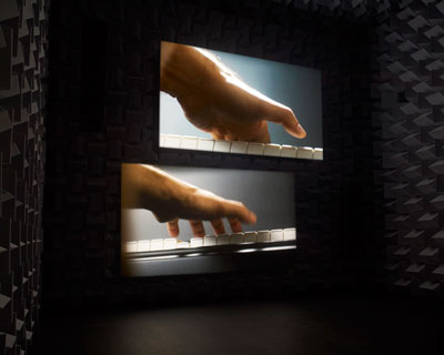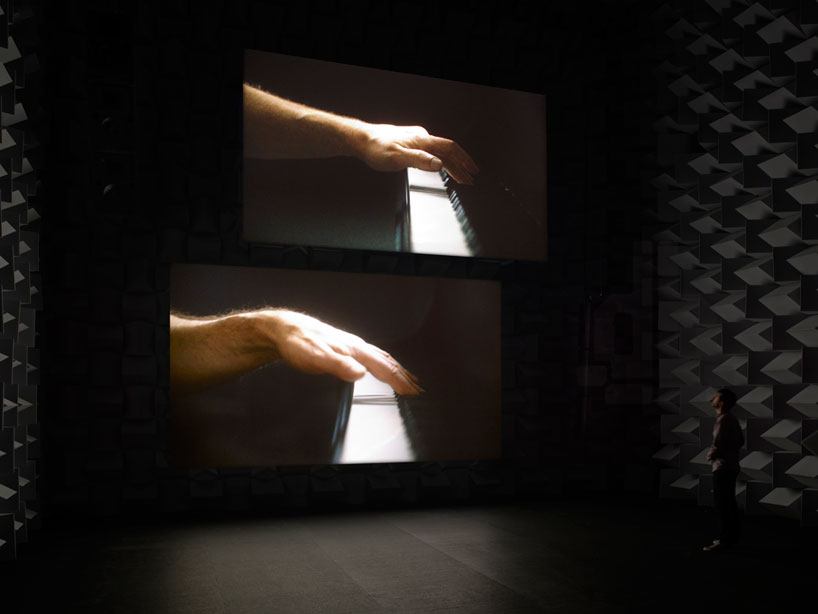 the two moving pictures run simultaneously within a semi-anechoic chamber, however the difference in tempo at which lortie and bavouzet play the score, results in a musical echo, almost like an affect of tempo rubato (robbed time). it is a result of sound designer olivier goinard’s sound spatialisation, that the visualization and sound within the space almost devoid of any noise, creates the impression of a musical ‘race’ as a result of the time discrepancies between the two performances–all orchestrated beforehand by anri sala, with composer and conductor ari benjamin meyers.