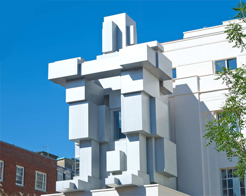 the façade of london’s new beaumont hotel has been topped by a giant crouching figure conceived by british artist antony gormley. ‘room’ is a geometrically stacked livable habitat formed through the piled composition of metallic cube upon cube, arranged to resemble a giant sitting man. ‘I take the body as our primary habitat.’ gormley describe ‘room contrasts a visible exterior of a body formed from large rectangular masses with an inner experience. the interior of room is only 4 metres square but 10 meters high: close at body level, but lofty and open above. shutters over the window provide total blackout and very subliminal levels of light allow me to sculpt darkness itself. my ambition for this work is that it should confront the monumental with the most personal, intimate experience.’