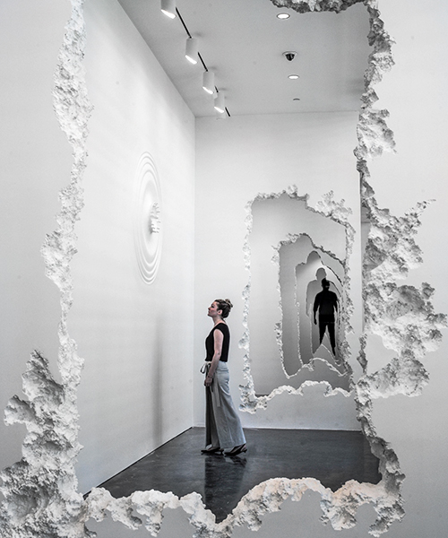 within SCAD museum of art’s pamela elaine poetter gallery, daniel arsham responds to the structure of the site with a 300 foot ‘wall excavation’ as part of the exhibition ‘the future was then’. arsham surveys the interaction between man and architecture — particularly human’s capacity for creating, destroying and repurposing the manmade and natural world — by digging through a series of faux-concrete walls. beginning with a crudely cut, abstract aperture, the repeated sequence of carvings finally becomes the silhouette of a human figure.