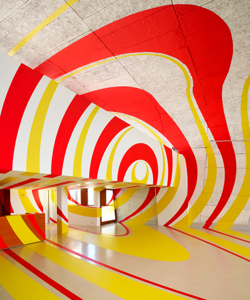 following in the footsteps of xavier veilhan, daniel buren and dan graham who have previously exhibited within the space – french-swiss artist felice varini has introduced multiple perspectives at the MAMO centre by painting striking shapes across the terrace. the ‘à ciel ouvert’ project references le corbusier’s distinct style, using modular forms which work harmoniously with the modernist construction. red and yellow primary colors are used to underline and accentuate different parts of the interior and exterior which presents an added architectural layer.