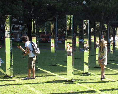 visitors to the grassy retreat of hyde park in sydney will find themselves immersed within a labyrinth maze of mirrors, reflecting the surrounding urban landscape like a kaleidoscope. auckland-based studio out of the dark has sent designboom images of ‘field’: their multifaceted installation comprised of 81 mirrored pillars set throughout a 25 square meter plane. the 2.4m tall posts are arranged in a grid around the park, and the rows and rows that make up the 324 mirror faces refract the constantly changing scenes of the trees, grass, and sky surrounding them. ‘field’ is one of five major projects part of the 2013 sydney art and about festival, and will be situated in the park until october 20th.