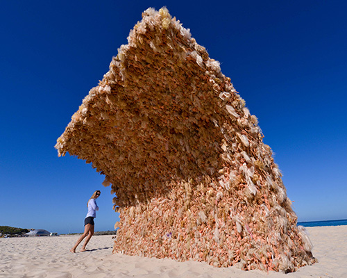 towering over 9 feet above the surface of cottesloe beach’s pristine sand in perth, australia is the monumental sculptural installation by belgian artist annette thas. ‘wave 1’, created for the 2014 sculpture by the sea, is intricately crafted from over 3,000 barbie dolls, collected from various second-hand shops — a symbol of the personal stories of every doll’s former owner. inspired by her own childhood memories and emotional reminders of her youth, thas wanted to find a way to universally represent the precious and short period of time through the piece. using an icon of play, whimsy and carefree adolescent amusement, thas worked with the barbie doll, weaving thousands of plastic toys together into an overwhelming, free-standing composition, rising above the indian ocean and soaring over visitors of the beach. at over 12 feet wide, those seated beneath the wave’s expanse are completely enveloped by its length. clearly influenced by its surroundings, thas’ installation references the forms from its environment, both juxtaposing and blending in to its surroundings. ‘wave 1’ has recently been selected as people’s choice prize at sculpture by the sea.