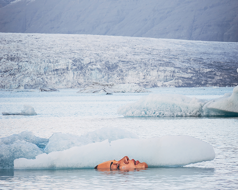 ephemerality is both physically manifested and used as a metaphor in the latest series of painted portraits by hawaiian artist sean yoro, aka hula. these recent murals have been rendered on the frigid surface of icebergs, freshly broken off from a nearby glacier. ‘a’o ‘ana’ (the warning) sees a submerged female figure ‘hidden’ beneath the water’s edge. the woman’s face painted on the side of the ice block just barely peers above the rising tide. on the adjacent shoreline, hula has painted the image of a reaching arm onto a glacial mass. the hand, extending outwards, points at the hundreds of icy objects surrounding it, which have settled on shore.