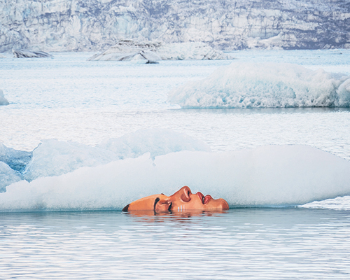 the woman’s face painted on the side of the ice block just barely peers above the rising tide