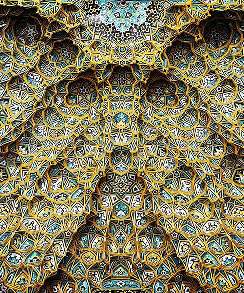 as home to one of the world’s oldest civilizations, iran is recognized for its ancient architectural wonders, whose often modest façades hide complex mosaic motifs and richly detailed ornamentation within. throughout the photographic series, the artist highlights the vibrant patterns extending along the diameters of domed ceilings, and the intricate network of symbols spanning across surrounding walls. the abstract captures and their cropped compositions seek to accentuate the labyrinthine geometries and meticulous tiling innate to iran’s architectural record.