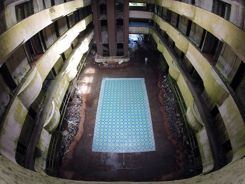 javier de riba has spray painted a vibrant ’tile’ floor on the ground of an abandoned 5-star hotel in sete cidades — a municipality of são miguel in portugal. ‘monte palace’ was only open for one year before an unsuccessful foreign investment left the resort in disrepair. now, the enormous, disused site stands as a symbol for island inhabitants against overindulgence and excess.