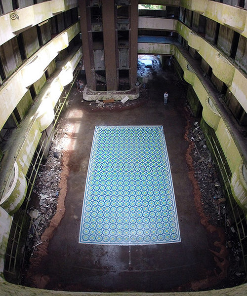 invited by walk & talk azores, javier de riba — working alongside collaborators minuskula, maria sofia meirelles, and verónica belchior — has filled the abandoned hotel floor with an intricate blue and while tile pattern. spanning the ground area of a large interior atrium, the composition reflects traditional tiling motifs, blending floral symbols and shapes to form decorative ornamentation. the patterns take shape through the meticulous layering of colors, applied by a spray painting technique in a specific sequence over time.