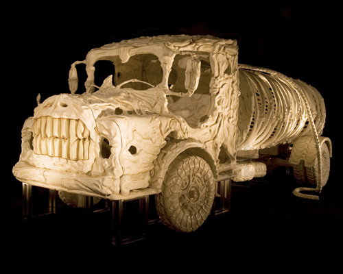 like the decomposed vertebrae of a prehistoric creature, the large-scale sculptures of jitish kallat resonate with a sentiment of death and mortality that are recurrent themes throughout the indian artist’s oeuvre. kallat’s series of bone vehicles references his own photographs of cars, trucks, bicycles, and buses that had been incinerated and torched during riots. he has transformed the visual of the burnt-umber endoskeletons into intricate white sculptures mimicking fossilized remains that he describes as ‘grotesque, burlesque and arabesque in equal measure’. ‘aquasaurus’ and ‘ignitaurus’ are two examples from the series — hybrid pieces that compound the aesthetic of mammoths found in natural history museums and specialized transportation devices from an automobile-expo. the refashioned carcasses can be seen as carrying, even through a playful approach, a broad and deep inclination of extinction and death. kallat is currently exhibiting work at art stage singapore presented by ARNDT, berlin.