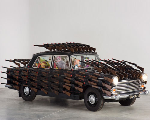 another first is the display of three of vasconcelos’ vehicle works together, each of which take a different mode of transportation as a starting point for her artistic interventions. at its core, ‘war games’ (2011) is a black morris oxford car that is adorned in toy rifles and LEDs, occupied by soft and plastic toys which squeak and move endlessly as its passengers; ‘www.fatimashop’ (2002), is a tricycle van filled with mass produced statues of portuguese catholic religious icon our lady of fatima, illuminated, accompanied by the video ‘fui às compras (gone shopping)’; and ‘lilicoptère’ (2012), conceived for her solo show at the château de versailles, in which the artist has covered a bell 47 helicopter with pink ostrich feathers and swarovski crystals, embellished with gold leave, needlework rugs, walnut wood and wood grain paintings. see designboom’s coverage of joana vasconcelos’ exhibition at versailles here.