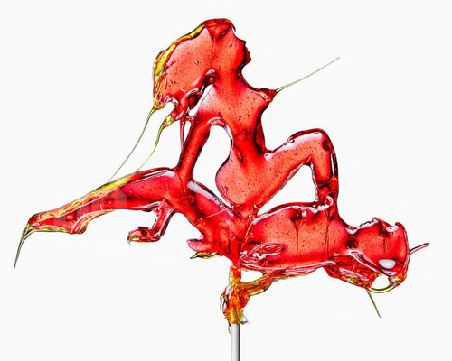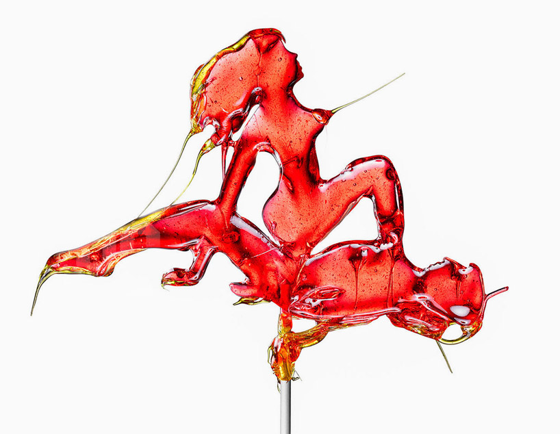 ‘sweet love making’, says italian artist massimo gammacurta of his ‘kamasugar’ lollipops. these insatiable edibles entangled in classic kama sutra positions clearly stimulate spectrum of senses. hot red, spicy orange and cool, sensual blue candy confections are sculpted in (extremely) erotic poses, with strands of molten drips and drizzles adding to their impassioned and savage quality.