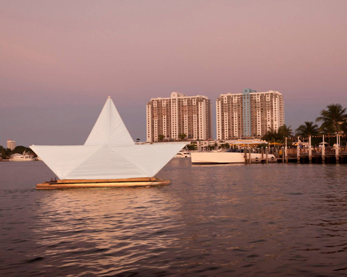 drifting in the biscayne bay and celebrating miami’s arresting waterfront views floats ‘paper dreams’ created by local artist and architect luis pons as a site-specific art installation commissioned by the standard for art basel miami beach. taking visual reference from humble folded boats crafted by children, pons’ sculptural ship scales up the classic model; ‘I’ve always been fascinated with the magical world of the child imagination,’ says pons, ‘right before reason takes over and consumerism takes hold‘. 30-feet-long, 15-feet-wide and towering 15 feet above the level of the sea, the structure comprises a sturdy bamboo frame, wires, and a white fabric sail constructed over a barge. occupying its core is a hammam fashioned from wood and lexan — a temporary extension of the neighboring resort’s indoor spa area — that illuminates a beacon-like green glow at night.