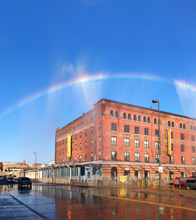 ‘the rainbow’ spans from one side of the street to the other, ending by the bemis center image by hesse mcgraw