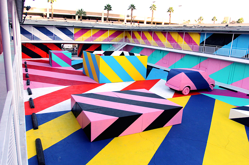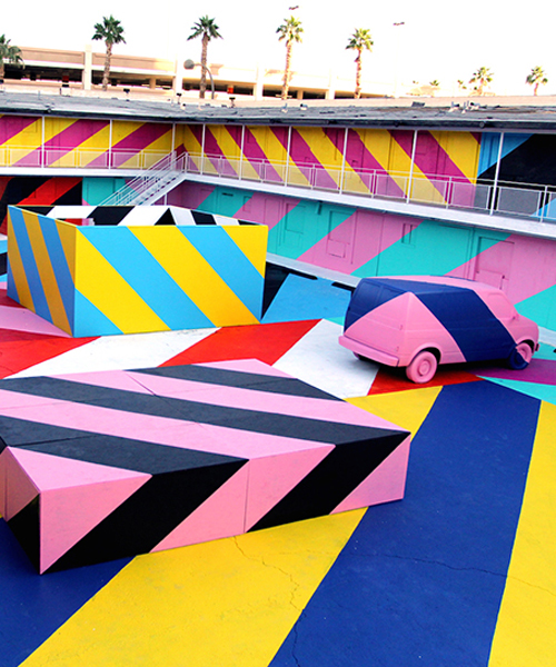 M: for me, every color evokes a different emotion and feeling, especially when paired with another color. I’ve gotten to the stage where I use mainly primary colors, as well as wanting to keep things simplistic, it also out of convenience. as a lot of my work is international, I try to keep to the same color palette to keep continuity to the work — they consist of ten colors; yellow, cyan, baby pink, mint, magenta, navy, orange, red, black and white. from these ten colors, I make over forty different color combinations. its a simple system that I have in place that allows me to share instructions if I’m in a different country and production starts before I arrive. the combinations are all based on contrast in colors, eg. hot and cold. this is inspired from my graffiti background where you’d always want your pieces to ‘pop’.