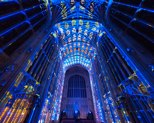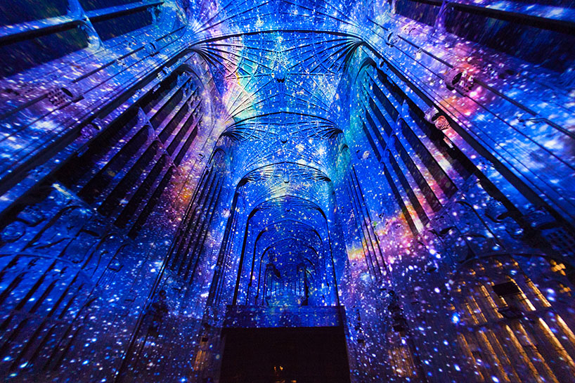 the site-specific installation highlights the architecture of the 16th-century chapel through lighting the high technicality of the cathedral’s fan vaults, one of the finest examples of late perpendicular gothic english architecture. the projections and the richness of colors from the digital installations create a resonant relationship with the illuminated stained glass windows. the installation gives the building life, generating an unprecedented visual experience. this is the first time that the university of cambridge has invited an artist to make a work of art in the chapel.