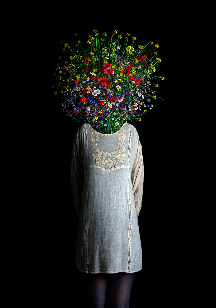 following the series ‘skins’ and ‘second skins’ (previously featured by designboom here), miguel vallinas continues to reflect on identity, existence and personal choice through his latest collection called ‘roots’. the photographs show fashionably dressed figures bearing ‘faces’ of seasonal plants and floral bouquets instead of human heads. while the body represents the stem and the head suggests the flora, the unseen roots are linked to the earth — the beginning and end of life. the botanical species each source their identity through the clothing they choose — colorful wildflowers wear a flowing embroidered dress; a bundle of straw dons a flannel button down shirt; a bouquet of sunflowers sport a slim sundress.