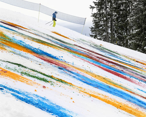using the form of the first tracks drawn by skiers as a source of visual influence, olaf breuning has transformed a snowy mountainside in gstaad, switzerland into a giant, colorful canvas. the swiss artist’s latest ephemeral work for ‘elevation1049‘ — a series of site-specific exhibitions set within the alpine landscape — gambles with the unpredictability and variability inherent in nature. using food coloring, breuning splashes and pours the liquid chroma onto the surface of snow, allowing it to slide and swivel down the sloping pathway. as the performance of ‘snow drawing’ takes place, vibrant belts of reds, blues, and yellows materialize on the pure white plane, ever-evolving as weather patterns and climate affect its overall aesthetic. the artwork will be on view to the public from now until march 8th, 2014.