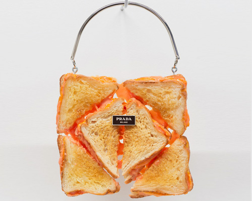 purses, backpacks, handbags and totes by the likes of prada, chanel and louis vuitton are reimagined in pancake, toast, bagel and bread form – gooey grilled cheese sandwich triangles make up the plush pattern of a prada purse; silver dollar pancakes sticky with syrup stack up to make a chanel shoulder bag; a whole loaf of poppy seed challah bread is imagined as a leather strapped backpack. cast in urethane and intricately painted with a hyper-realism that constitutes a trompe l’oeil effect, wise recontextualizes the pricey products as art objects instead of purchasable goods, where food and fashion are rid of their value and become solely symbolic of the frivolity of excess.