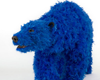 italian artist paola pivi presents the inaugural exhibition ‘ok, you are better than me, so what?’ for galerie perrotin’s new york location, a two-floored collection of sculptures and interactive art pieces. upon entering the gallery, eight giant creatures greet the viewer, posed prancing and romping around the room. the massive animals are life-size sculptures of bears, whose fur takes on a medium of head-to-toe, neon-colored feathers. the foam grizzlies are arranged in various postures, leaping through corridors, tumbling on their backs, and engaging each other in a dance. made from urethane foam, plastic and feathers, the plumed critters called on a canadian taxidermist for their correct proportioning and modeling. with names like ‘mama no more diapers, please’ and ‘who told you white men can jump?’, the vibrant figures are full of personality and their individual quirks and charms lend an amusing tone to the exhibition.