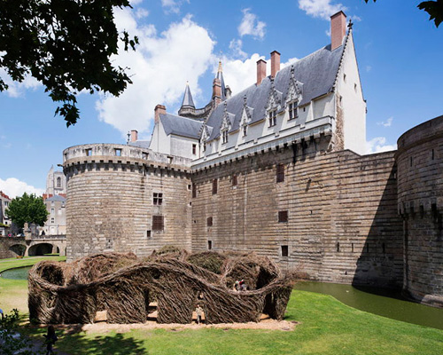 american sculptor patrick dougherty has woven a stickwork at the castle of the dukes of brittany in nantes, france. ‘fit for a queen’ is an ephemeral structure made of branches, cascading in perpetual movement, reaching a monumental scale and enveloping those inside within a maze of organic material. set in the fortress’ moat, the installation invites viewers to enter and explore the tangled passageways and windows built into its tree-like expanse. the project has been realized for this year’s edition of le voyage à nantes.