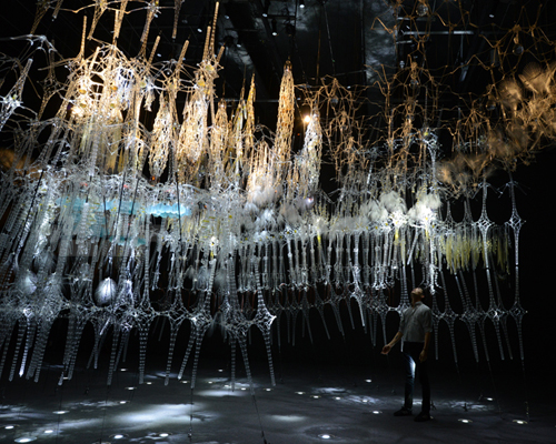 envisioned as an archipelago of interconnected halo-like masses, the ‘epiphyte chamber’ by canadian studio PBAI philip beesley architect inc. mimics human sensations through subtle, coordinated movements. conceived as an ‘epiphyte’, an aerial plant species that can grow without the support of soil, the immersive sculpture explores artificial intelligence, digital fabrication and interactive technologies to create a near-living environment. across each floating island, densely interwoven structures and delicate canopies made of thousands of lightweight components are drawn together in harmonious breathing and whispers. hovering fabric helps to frame the suspended pieces, lined with bulging, fluid-filled vessels and glands. the faunal groups contain metabolisms with chemicals, which move in response to slow reactions.