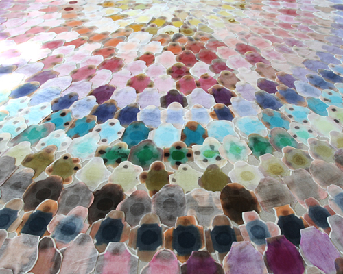 throughout her work, new york based artist polly apfelbaum examines postwar abstraction in relationship to popular culture. the work occupying the gallery floor at the perez art museum, miami refers to the sinister monkey character from the popular cartoon series, ‘the power puff girls’.‘mojo jojo’ is made from hundreds of shaped pieces of dyed velvet — using all 104 colors produced by the french fabric dye company sennelier — placed directly onto the ground. spanning 18 feet in diameter, the massive spiral is rich in varying colors and hues, changing their value depending on both the angle of the viewer and the light that enters the space. an important aspect of the work to apfelbaum is this captured sense of fluidity, as the chroma is constantly evolving and moving along with the observer. its circular geometry and fabric dyes reference the carpets, quilts, and domestic hand-crafts that were influential to the artist during the 1907s, while tie-dye, popular during the late 1960s inform the palette. ‘mojo jojo’ is currently shown for the exhibition ‘americana: formalizing craft’ from now until may 2015.