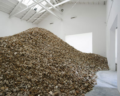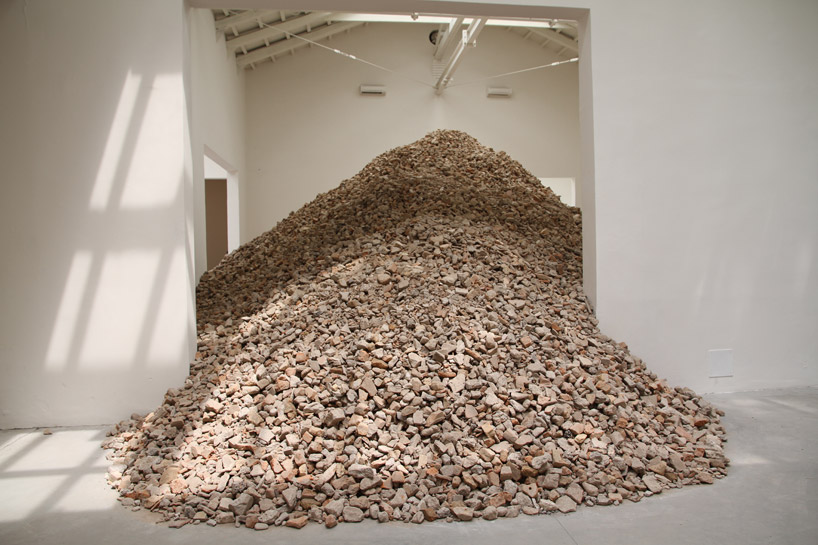 the central room of the pavilion is taken over by mountain cement rubble, roofing tiles and bricks smashed to gravelphoto claudio franzini