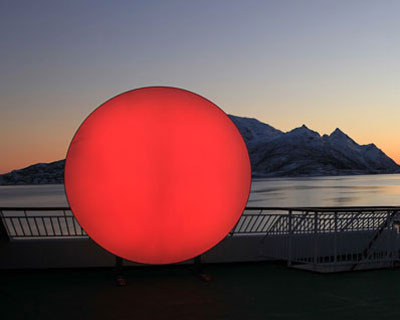 in response to the cold, dark norwegian winters — when some areas of the scandinavian country lack natural light for as long as three months — designers lisa pacini and christine istad envisioned a creative project that would restore illumination to the darkened domain. ‘sun’ is a circular light sculpture, three meters in diameter, whose glowing chroma slowly variates between a rich scope of warm colors, mimicking the golden sunlight at daytime and deep blush hues as it sets. the duo crafted the fixture from LED lights, and its construction allows for it to be free-standing on a base, or to be hung as an art installation on the facade of a building. transporting the luminous shape by cruise ship and pickup truck, the team weaved around norway’s lightless towns, acting as stand-in for the missing sun. the journey has just stretched to the UK, where the lucent round structure became the focal point of the 100% norway show opening for london design week on september 19th.