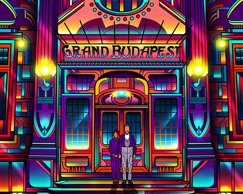 the collection of ‘one point perspective’ illustrations are drawn with a single vanishing point near the center of the frame, with all lines converging at this chosen spot. defined by vibrantly hued neon colors contained within thick black lines, the images offer completely new interpretations of movies like ‘the grand budapest hotel’ and ‘pulp fiction’, while still maintaining recognizability.