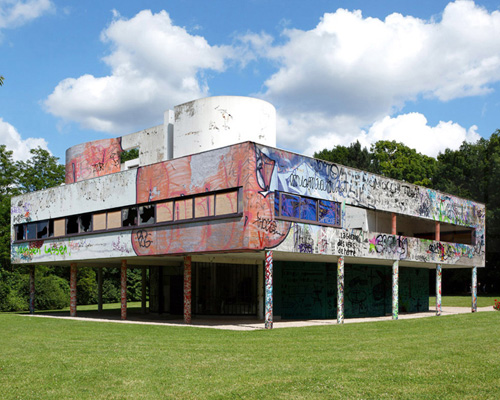 the photoshopped series of images are a tribute to architectural monuments around the world. the first stopover is ‘villa savoye’ and its creator le corbusier, one of the founding fathers of the modern movement. the iconic structure has been ransacked and vandalized. the ribbon windows that navigate its perimeter have been shattered, haphazard strokes of paint ornament its pilotis, and large pieces of graffiti cover its stark white free façade. the manipulations intend to make a statement about the ‘five points of architecture’, and in turn, highlight the death of modernity.