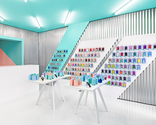 the exterior façade also incorporates the bold angles and colors of the new graphic identity, with the windows containing lines such as ‘doctor manzana? is it an orthopedic doctor? no! it’s a team of technicians specialized in smashes, drops and accidents for smartphones and tables.’ an integrated system blows air throughout the store, while details such as the blue curtain refers to aspects of hospital design. industrial looking galvanized steel sheets are contrasted against white furniture and pastel colors.