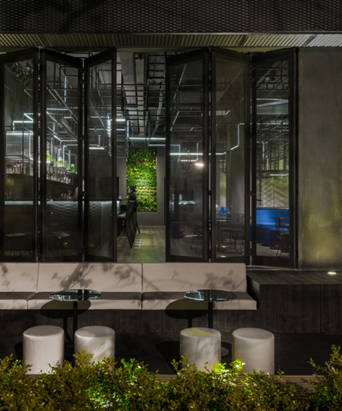 throughout the space, elements including floor-to-ceiling green walls and a plant/polycarbonate wall installation are contrasted by angular, synthetic components. the latter is most manifest in a dramatic drop ceiling of geometric metal forms and strip lighting. drawing from chemical structures, the irregular frames create a futuristic maze that seamlessly transitions into the bar and tables opposite.