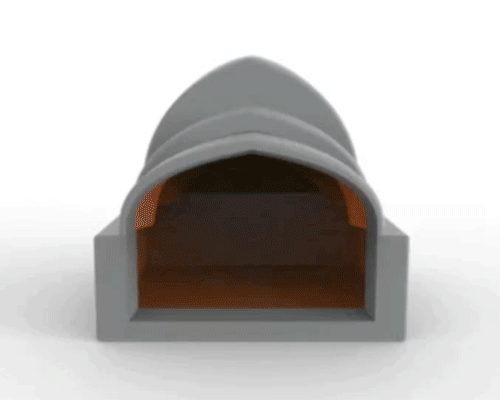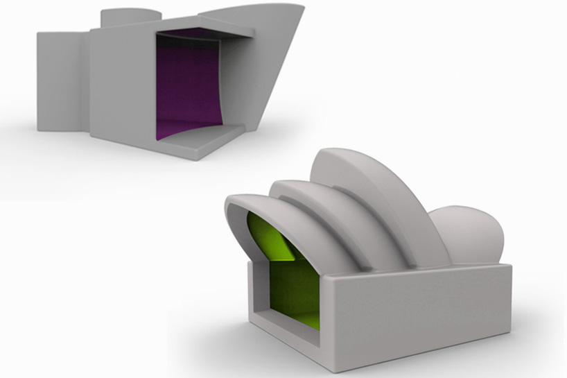 ‘with this project, the kennels for animals finally become chic and fashionable and we wanted to explore the issue of scale and the size of an object which is always relative to a point of view,’ says lanzillo. in doing so, the follies reinterpret history with the formal manipulations that have made jørn utzon’s ‘sydney opera house’ and  frank gehry‘s ‘guggenheim museum in bilbao’ famous. each shelter is constructed of polyethylene and manufactured with rotational molding technology. this process allows for two sizes that can adapt to any dog or cat. after printing, the volumes must be cut in front to provide a main entry into the comfortable environments. in addition to the monochromatic versions, through the technique of using two mixtures at different steps during development, multi-color models are available with contrasting interior and exterior hues.