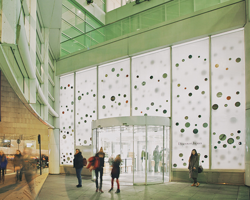paris-based studio ARCHIEE has covered the façade of the ‘maison de la culture du japon à paris’ with an artwork of integrated japanese ceramics. the installation is the first project for discover japan, a japanese magazine which focuses on local culture and tradition, and is intended to help the promotion for its newly launched boutique in paris. the design is a reconstruction of the landscape created on japanese dinner-tables with ceramic dishes called ‘minou-yaki’. the 6m high façade of the building is concealed by a fabric surface with 282 minou-yaki integrated into it, as if it were a huge table standing up vertically. the pieces are fixed into the material to give the impression that they are floating, but are fully detachable so they can be resold at the store after the installation.