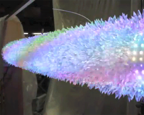 the technological engineers of london-based asylum have been approached with a private commission, requiring a domestic installation a pipe covered in translucent gems that light up to decorate a construction feature within a room. in response to the brief, the team has fabricated a base structure which allows them to implement all the necessary electronics. along its cylindrical form, circular RGB LED bulbs are evenly dispersed in both directions to exude a range of over 16 million colors. 2,912 modules are fitted, totaling to approximately 9000 individual lights. each one is controlled by an industrial embedded linux computer for added reliability, which hosts a webpage accessible via mobile phone. this allows the client to customize the shades, hues, and patterns at a click of a button to create any atmosphere he or she would like to inhabit. the overall experience is emphasized with a tactile effect provided by a light diffusing outer shell slotted over the top of the figure, which has over 3000 individual crystal shards glued to its surface.