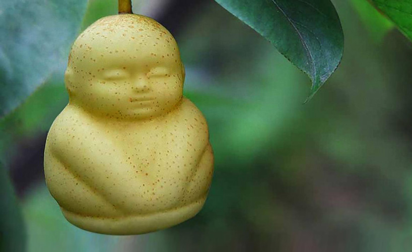 with the help of fruitmold‘s plastic products, pears shaped like babies are growing from trees on farms in china and being sold at supermarkets in neighboring areas. with peaceful closed eyes, miniscule nose and mouth and daintily crossed hands, the infantile forms look oddly realistic. during the fruit’s developmental stages, the farmers apply a frame around the budding pear, which it eventually grows into and realizes its shape. in addition to selling the quirky harvests in nearby markets, the suzhou-based company ships their plastic devices across the globe, so baby-shaped pears — and other produce — can be grown all over the world.