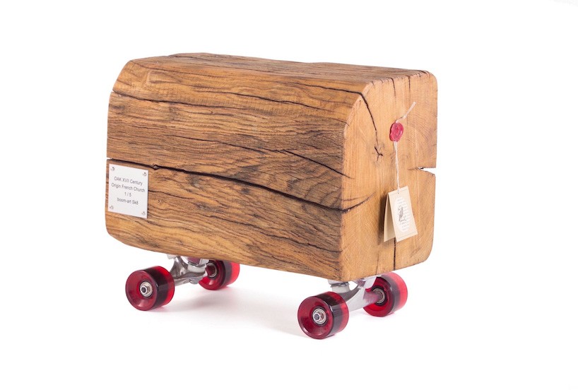 looking at the skateboard ‘louis XIV’, the choice of its name might seem surprising to the public: according to boom-art, this product actually serves as a table or bench with wheels — hence the allusion to a skateboard. for this exclusive collection, only five ‘skateboards’ were produced — constituting the full beam of the wodden block. thanks to the oak’s natural state, each copy is unique in its overall texture and shape.