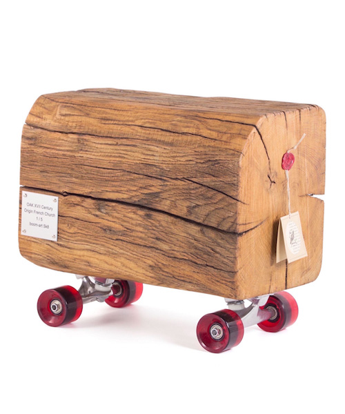 dedicated to the cultures of surfing and skateboarding, french art gallery boom-art introduces its latest limited edition: the skateboard ‘louis XIV‘. this unique object is made out of a 300 year-old oak block salvaged from a seventeenth century french church structure — bringing together two distinct eras into one product.