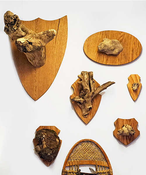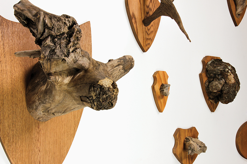 for woodlove, a curated space at the interior design show 2016 of locally-made ontario wood products, brothers dressler present their ‘trophies’ collection, which reappropriate the tips and ends of salvaged river-swept roots to evoke species of native wildlife. ‘these weathered slices of wood are the off-cuts from our root tables, which feature a solid wood top balanced upon the cleaned roots of trees lost due to farming irrigation in southern ontario,’ the brothers describe. sculptural pieces of maple, ash, hickory and walnut are mounted onto oak plaques and displayed on the wall like a hunter’s prize; yet through the quirky species of objects, the brothers dressler instead remind us to preserve and treasure earth’s resources rather than choose to destroy them.