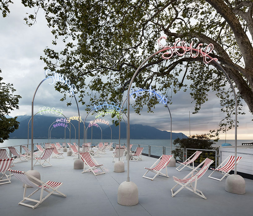 interpreting the montreux jazz festival’s aesthetic of light and glamour, swiss firm bureau A designed a series of glowing neon boardwalks along the water’s edge. located on the eastern end of lake geneva in switzerland, the famous festival has been the place of many legendary jazz and rock concerts. the project’s neon signs reinterpret the character tony soprano’s the ‘bada bing’ night strip-club from the famous HBO series – an expression also used by sonny corleone in the film the godfather.