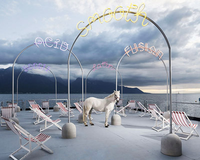 temporarily installed over the water, the boardwalk was reorganized entirely for the festival with a series of new decks, taking advantage of the great scenery. occupying each one of the extruding jetties was a series of generic words: one designated to food for the food court area (pizza, paella, kebab) and another expressing jazz-history based styles: be-bob, latin-jazz, jazz-rock, boogie-woogie, on the lake decks. illuminated typography was supported by a freestanding segmental arch structure – the classical structure used as a framing device is capable of capturing romantic views of the lake and alps.