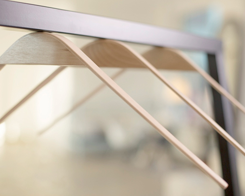 german-latvian designers georg dwalischwili and janis karklins of flow design have completely overhauled the design of the ubiquitous clothing hanger with ‘cliq’ by eliminating the hook from the hanger. replaced with strong earth magnets instead, the minimal natural birch hangers are capable of supporting up to two kilograms of weight, holding wardrobe items such as suits, coats, sweaters or t-shirts. the cliq can be used on any metallic tube or surface, and because the magnets create equal gaps between the hangers, clothing racks always appear organized.