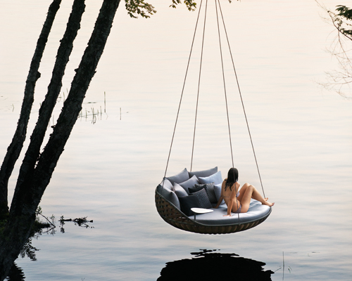 borrowing a basket-like aesthetic from ‘nestrest’, french designer daniel pouzet has presented his latest hanging lounge chair for brand dedon. entitled ‘swingrest’, the outdoor furniture piece draws reference from the high ceilings of dedon’s outdoor living lab island resort in siargao, philippines, providing a tranquil space for hanging over the lake or relaxing on the terrace. featuring a unique suspension system for stability, the lounger also incorporates a 180° rotating tabletop and special cord that wraps around its exposed tubing. the ‘swingrest’ comes available in a natural colored weave, with an optional fabric curtain for added shade and privacy.